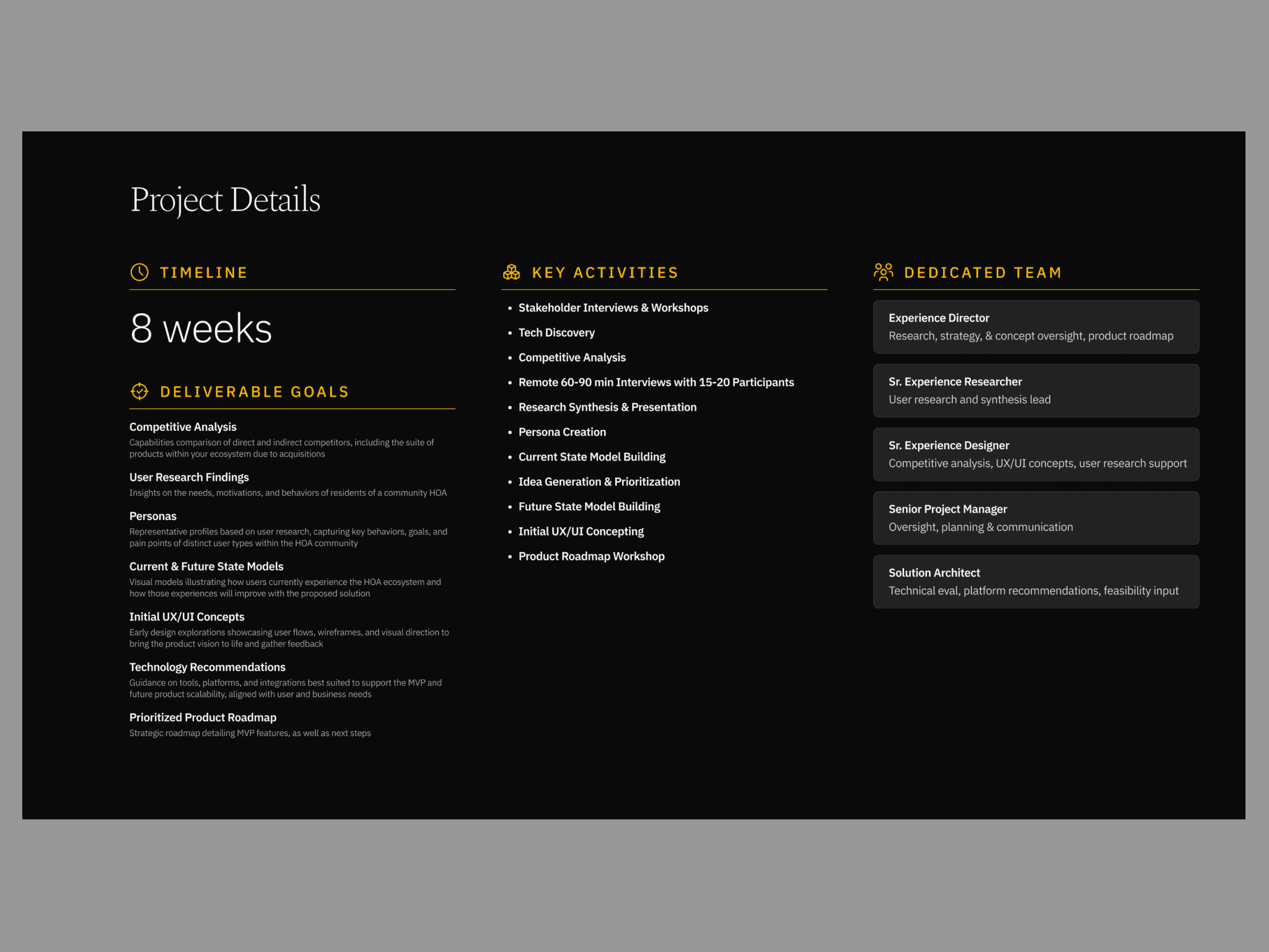 When introducing design research to executives, my focus is on clarity and confidence. Most leaders haven’t seen the inner workings of discovery, so I take time to show what we’ll actually do—the sequence of activities, team roles, and milestones that lead to meaningful insight. This transparency helps executives see design as structured, accountable work that de-risks decisions before investment.
