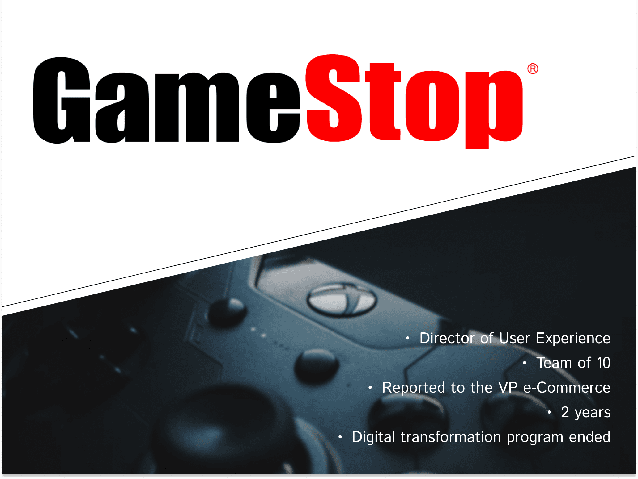 As the UX Director at GameStop, I lead the team shaping the experience across numerous digital initiatives during an intense transformation to improve GameStop's digital business through enhanced e-commerce sales, mobile conversion, digital-to-store connections, and the acquisition of digital properties.