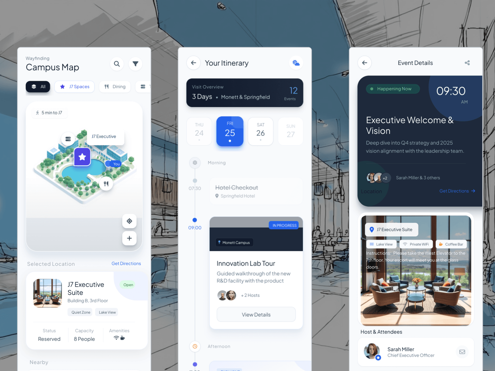 We helped a large financial services organization transform its remote headquarters into a connected, hybrid-era campus—where space, technology, and service moments work together to create a distinct journey for employees, customers, and prospects. The goal was a hospitality-driven experience that could flex between collaboration, quiet focus, and executive engagement without losing coherence. My part was to connect the space with a digital layer that’s right for visitors and executives.