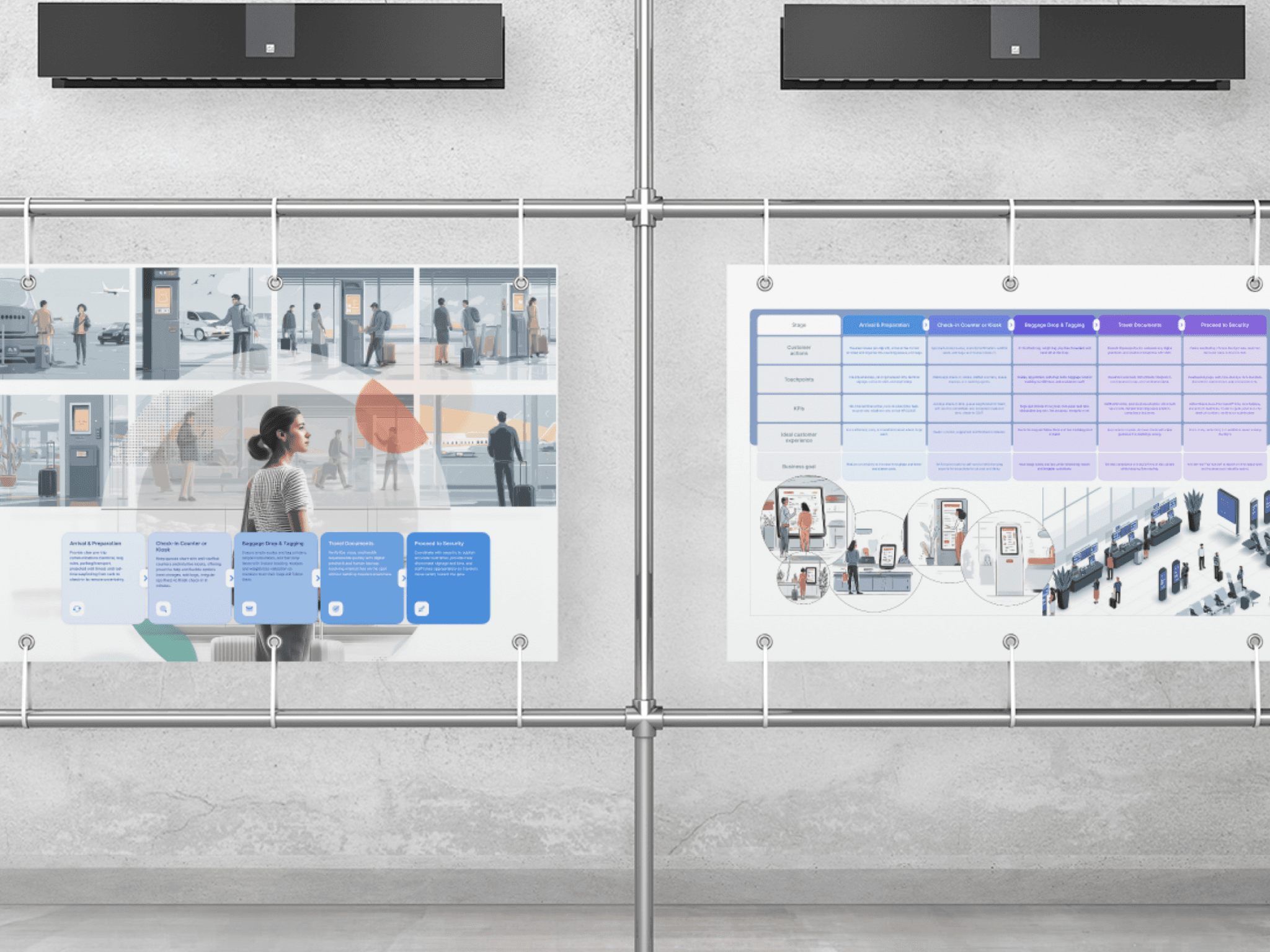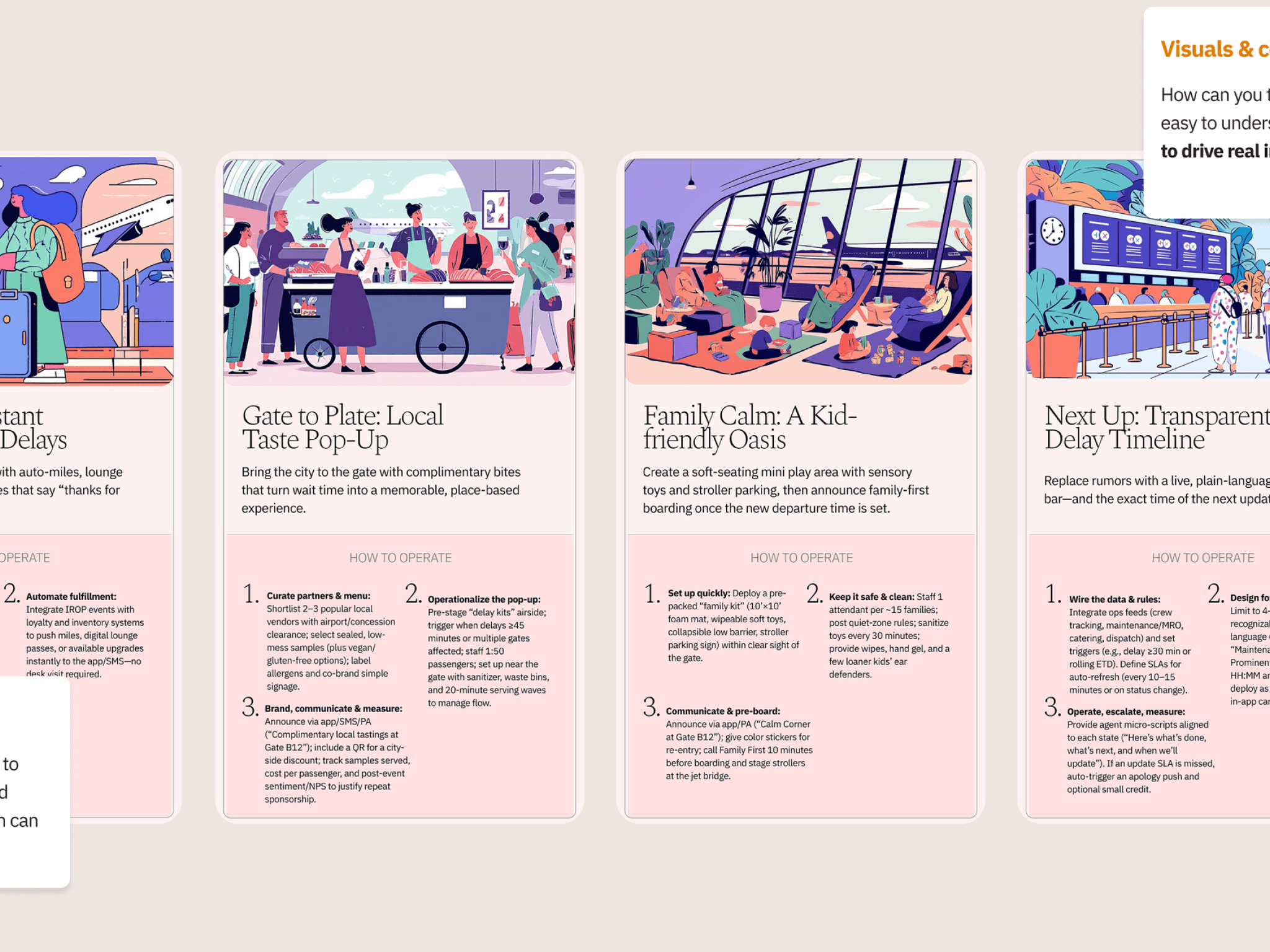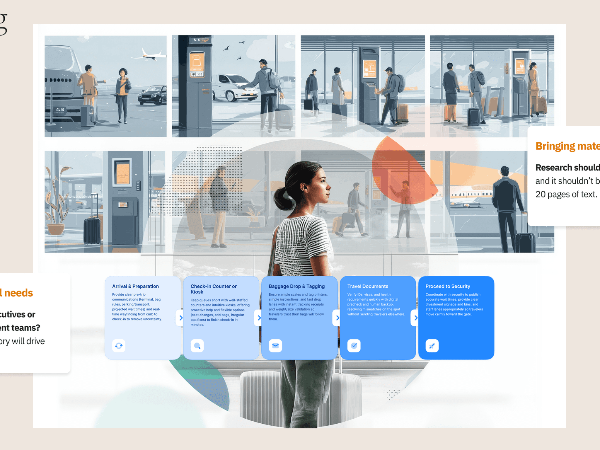 I synthesized the existing research and recast it into a visual, narrative toolkit centered on the TimeSmart Traveler. This included a detailed persona, curb-to-rideshare journey maps that highlighted moments of truth and pain points, storyboards that showed the emotional highs and lows of a trip, and practical playbooks that translated insights into specific actions for teams (airport operations, digital product, loyalty, etc.). By shifting from “static research” to “living visuals” that were easy to reference in workshops and planning sessions, the organization gained a common language for prioritizing improvements, reducing friction, and designing experiences that respect travelers’ time at every step.