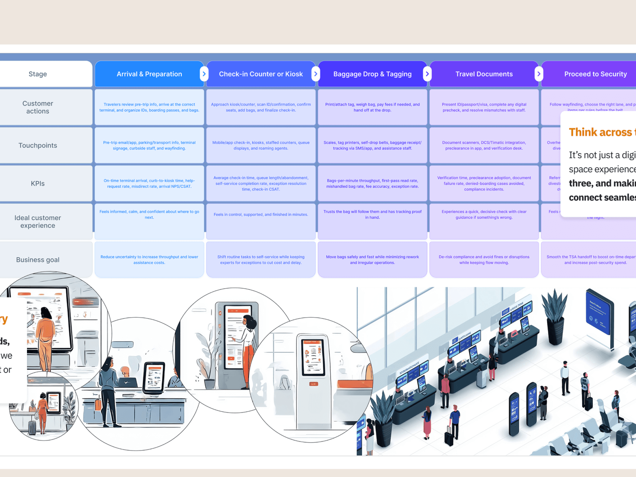 The client had plenty of research but very little shared understanding. Teams knew travelers were frustrated, but the insights were buried in decks and reports that weren’t influencing day-to-day decisions. The TimeSmart Traveler—a high-value customer who wants to minimize friction, stay productive in transit, and keep control over bags, upgrades, delays, and expenses—was experiencing unclear lines (kiosk vs. counter vs. bag drop), last-minute gate changes, silent policy “gotchas” (carry-on sizes, visa/APIS), and disjointed handoffs between the airline, TSA, lounges, and rideshare. None of this was visible in a simple, end-to-end picture that cross-functional teams could act on.