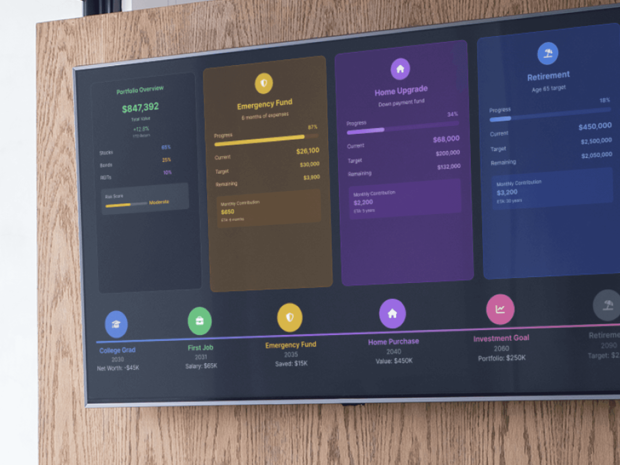 An interactive digital wall models financial journeys in real time, giving the client and advisor a single shared view to explore scenarios, align on information, and decide together.