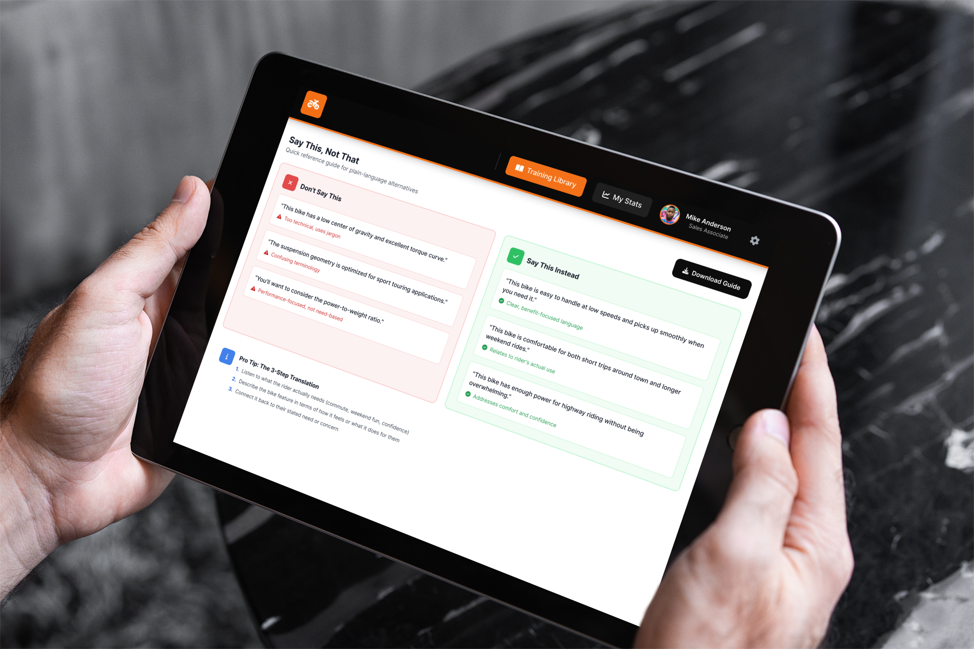 Associates were great at rapport, but conversations often stalled in “just chatting,” bike jargon, or spec talk—leaving newer riders uncertain and without a clear plan. The store needed a repeatable approach that reduced intimidation for first-timers while still feeling personal and helpful.